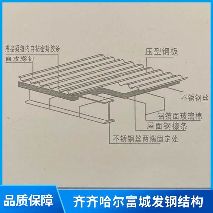 挂网式玻璃棉夹芯板屋面板是可直接承受屋面荷载的板。屋面板位于房屋的屋顶,一般使用铝镁锰或合金等金属制成。屋面板在房屋顶层的山墙斜梁上组装后,翼板则搭接遮盖使多个单体箱型屋面板不出现见光的垂直缝,形成整体性良好的坡屋顶。